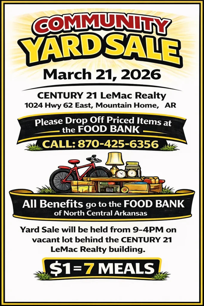 Community Yard Sale with all proceeds going to benefit the Food Bank of North Central Arkansas, March 21 at 9-4pm.
